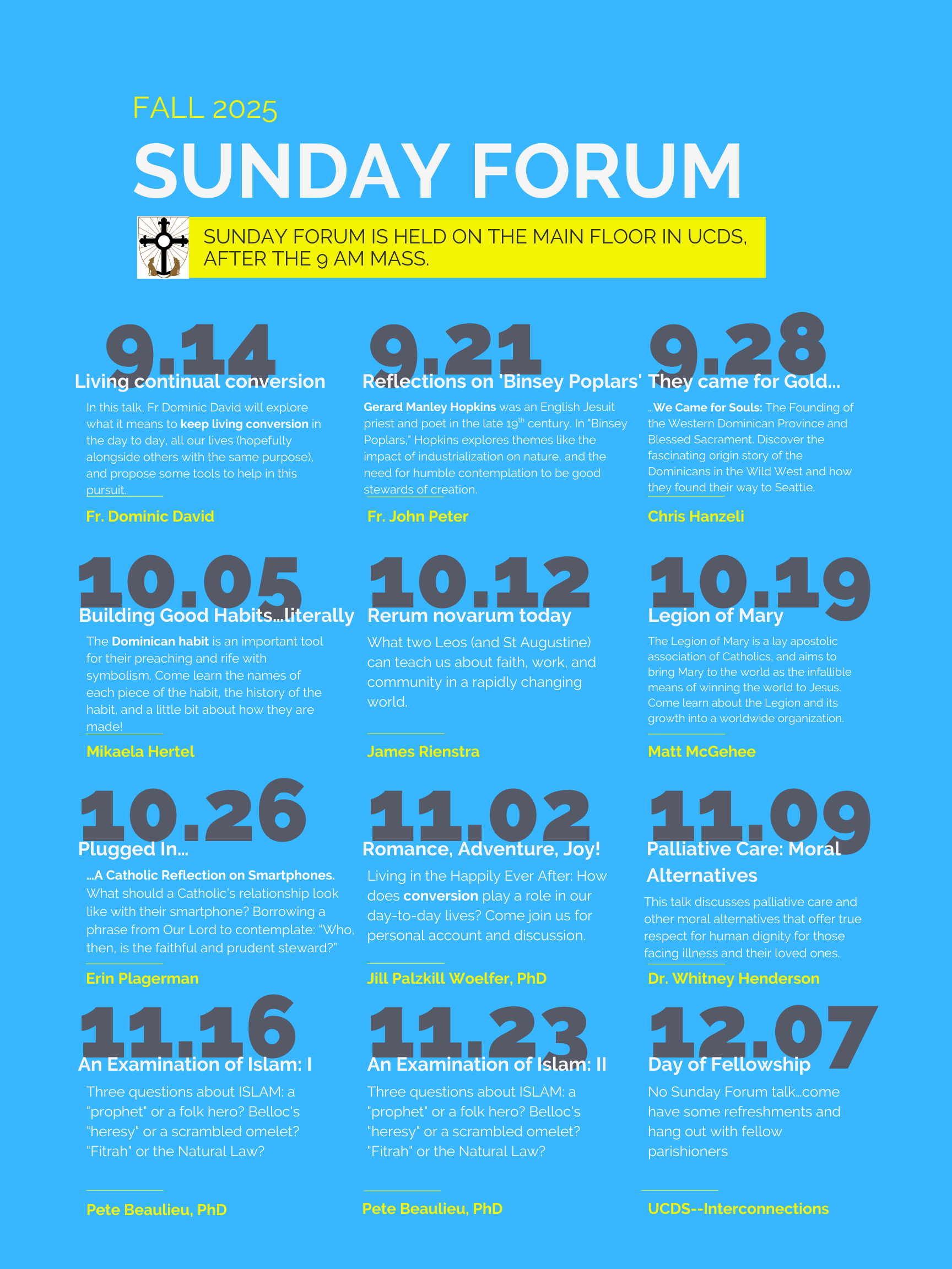 Sunday Forum is an opportunity for parishioners to continue to grow and enrich their own faith. Most Sundays during the school year, in conjunction with the Sunday School schedule, a parishioner or guest is invited to speak on an engaging topic related to our faith. To find out more or to volunteer, reach out to Gaylan Adair at gadair@bspwa.org.